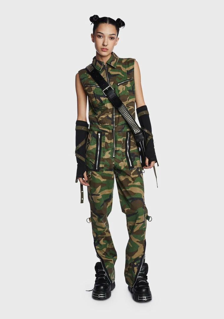 cuz you live life on the edge. This sleeveless cargo jumpsuit has a stretch twill construction with a camo print all over, pockets on the front, zipper and D-ring hardware, and an elastic back waistband.