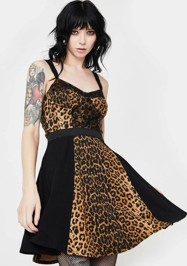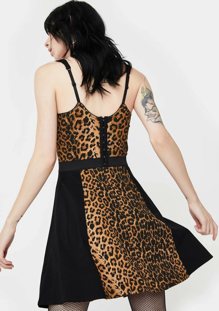 cuz no one said you like to play fair, babe. Keep âem on their toes in this tank fit Nâ flare mini dress that has a sweetheart neckline with underwire construction, adjustable straps, sassy leopard print all ova Nâ back hook N’ eye closures.