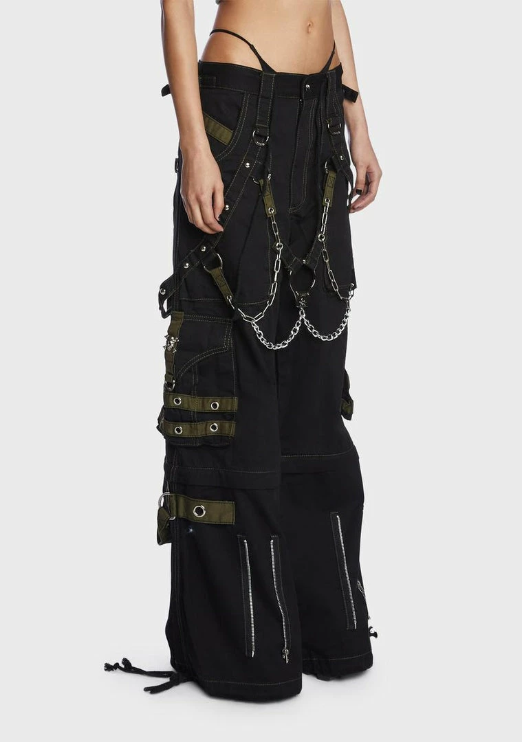 cuz you never back down. These baggy wide leg pants have a twill construction, an adjustable drawstring waistband, army green trim with eyelet hardware, deep cargo pockets, detachable handcuff chains and suspender straps, skull enamel detailing, and a convertible zip-off leg design so you can also wear them as shorts.