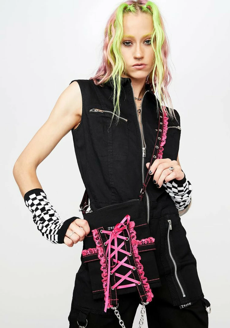 cuz you’re a darkstreet diva. This crossbody bag has lace-up details with lace trim and an adjustable shoulder strap.