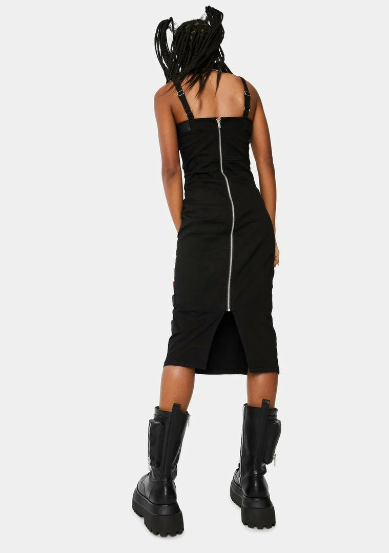 cuz you stay strapped. This midi dress has a bodycon fit, horizontal buckle straps down the front, and a back zipper closure.