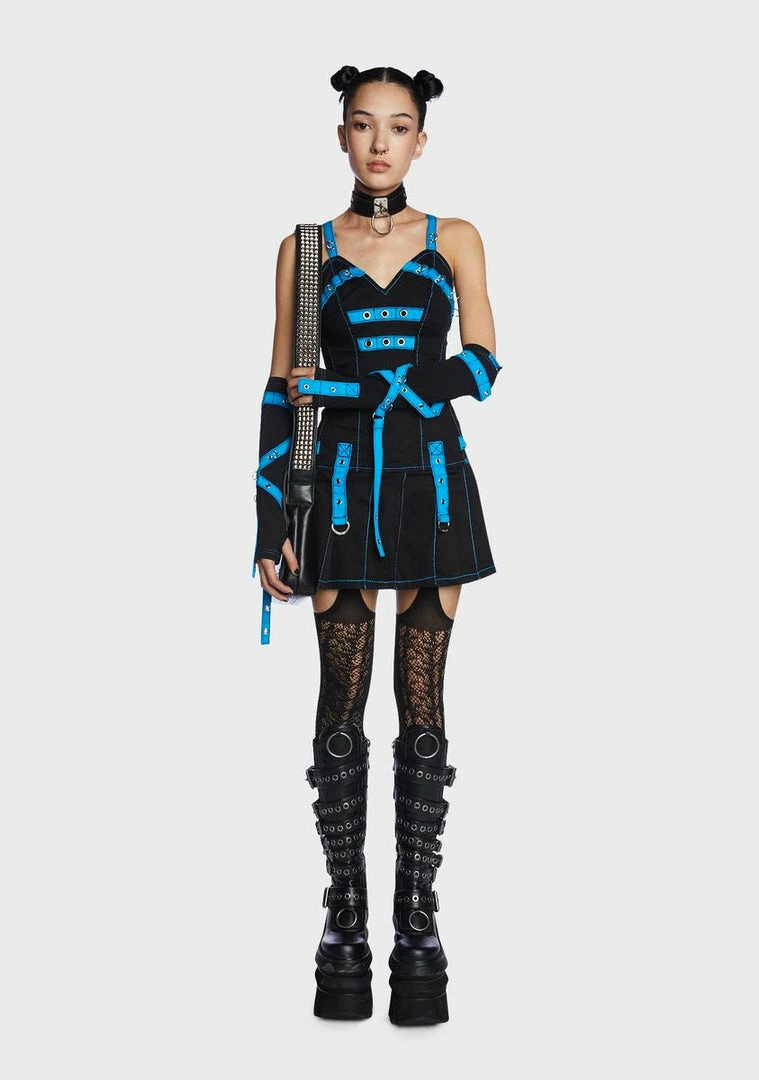 cuz you’re a troublemaker. These fingerless arm warmer gloves have contrast bright blue straps with grommet and ring hardware.