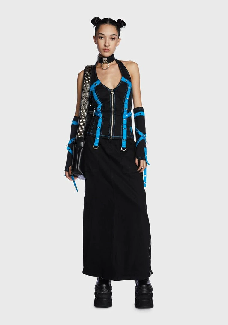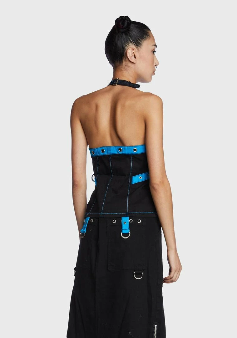 cuz you’re a troublemaker. This corset top has a stretch twill construction, contrast bright blue trim, a V-neckline with an adjustable halter strap, grommet and ring hardware, and a zip-up closure with a skull charm.