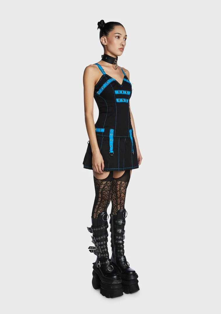 rough ’em up, babe. This pleated mini dress has a stretch twill construction, contrast strap detailing with grommet and ring hardware, adjustable shoulder straps, and a back zip closure.