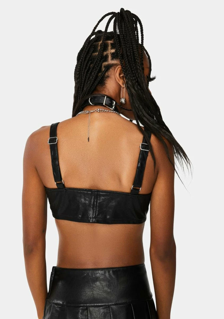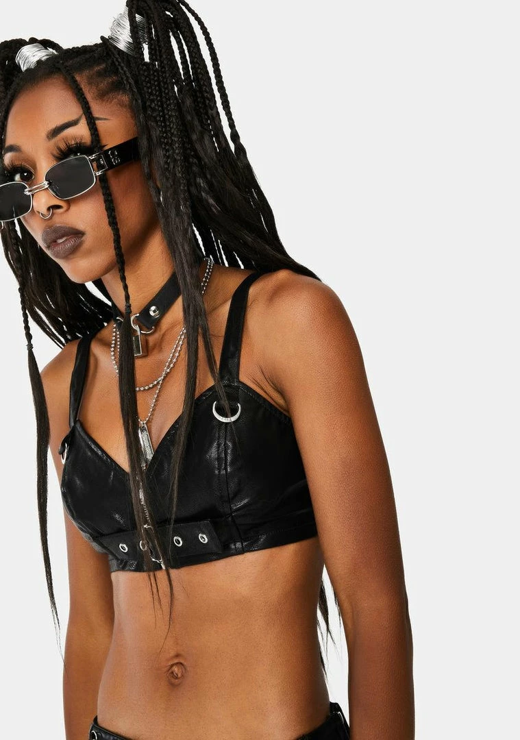 don’t waste your breathe. This bra crop top has a faux leather construction, a front zipper closure with a buckle strap overlay, and adjustable shoulder straps with D-ring hardware.
