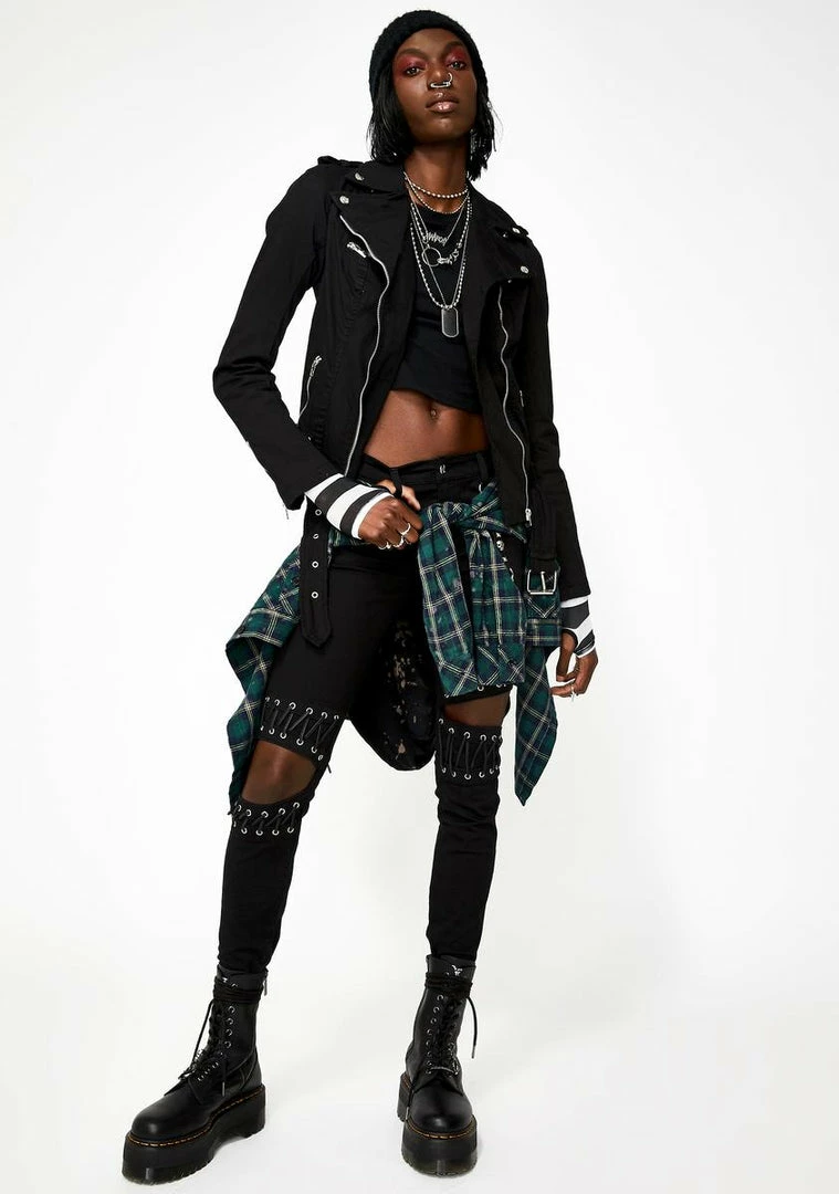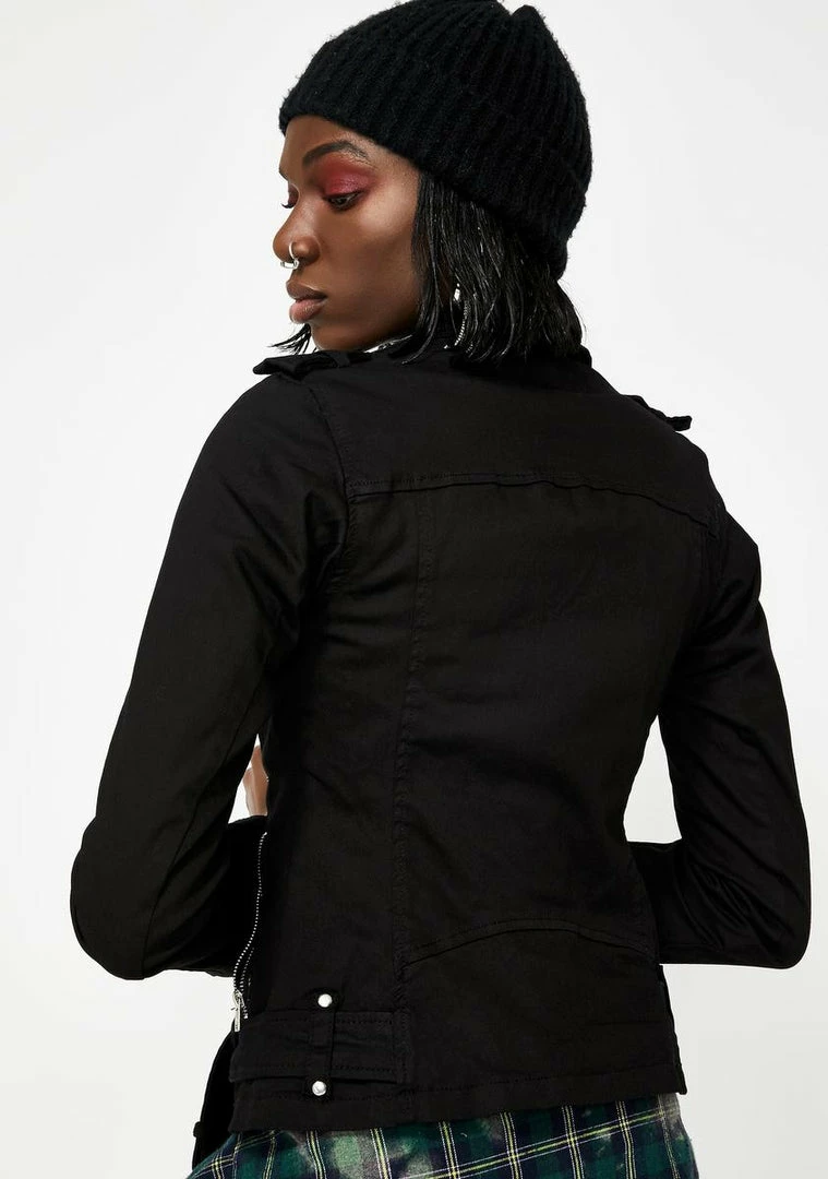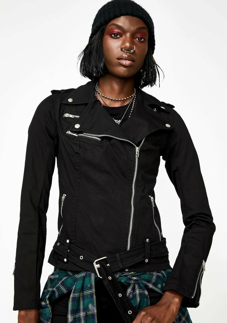 gotcha rollinâ with the punches. Tough it out in this sikk moto jacket that has platinum stud hardware, side pockets, an adjustable belt and front zip closure.