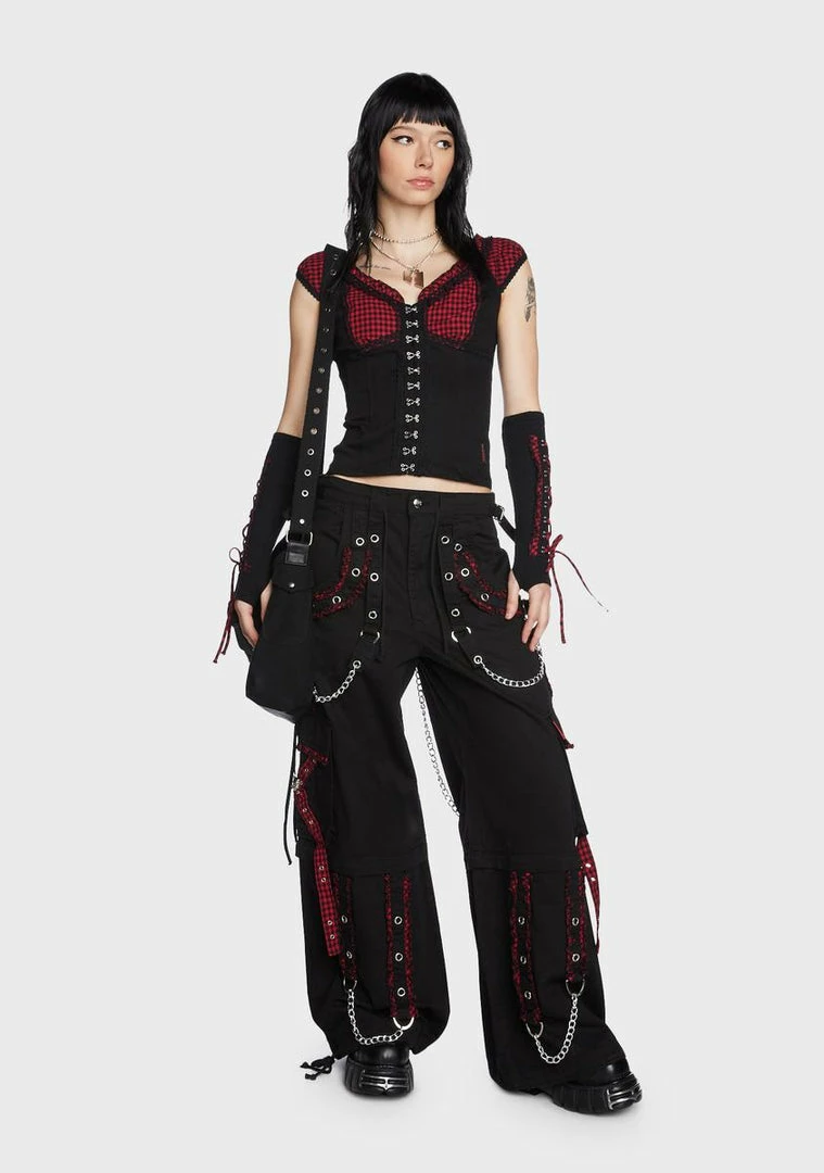 cuz you come alive in the dark. This corset top has gingham print panels, a milkmaid-style bust with lace trim, short cap sleeves, and hook-and-eye closures at front.