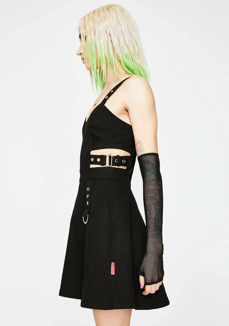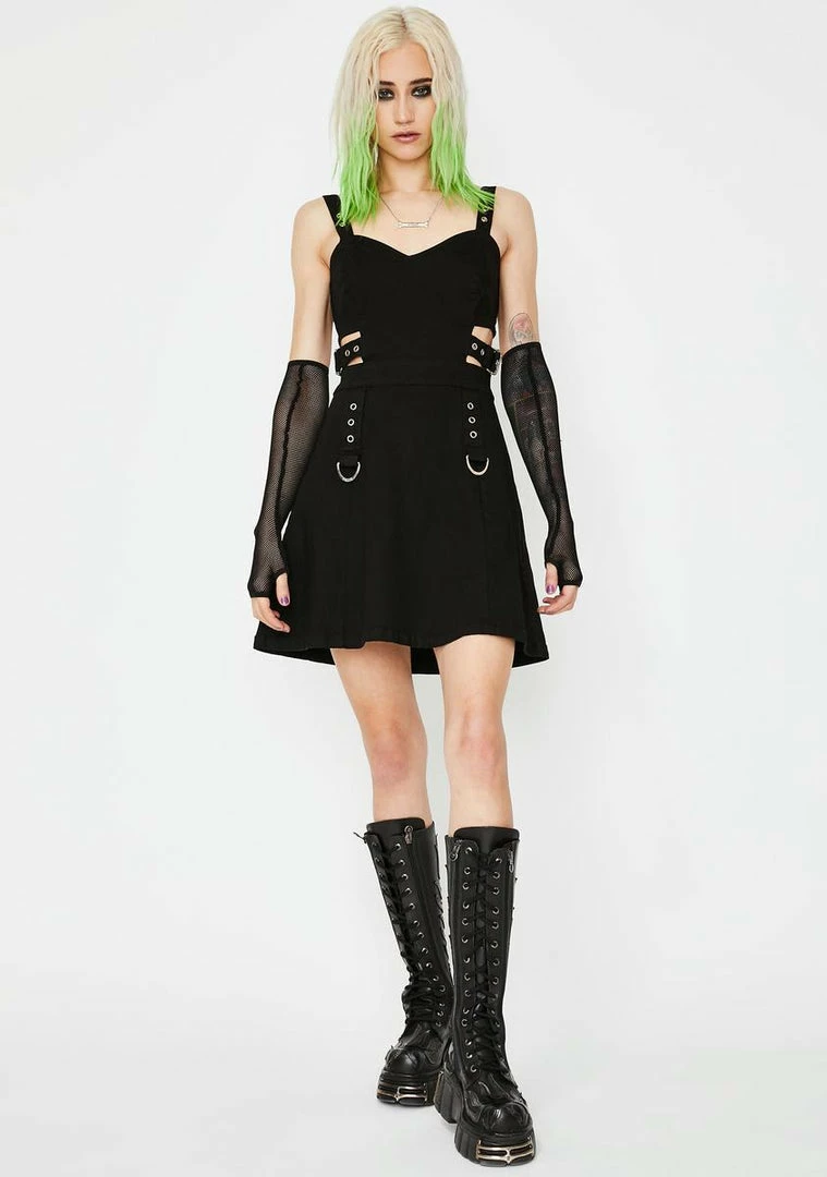 cuz youâre totally unattainable, babe! Show âem what theyâre missing in this sweetheart mini dress that cut-out sides with strappy details, grommet Nâ D-ring accents, adjustable straps, and a hidden back zip closure.