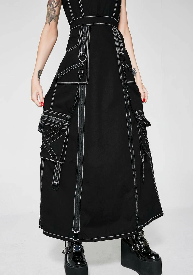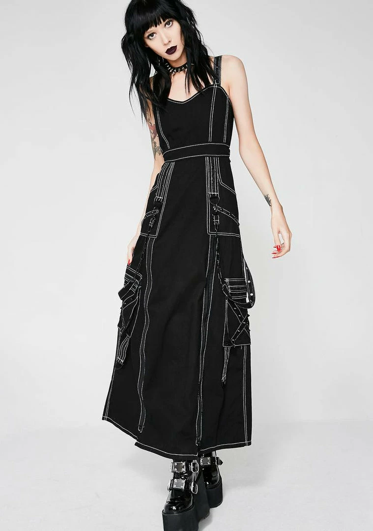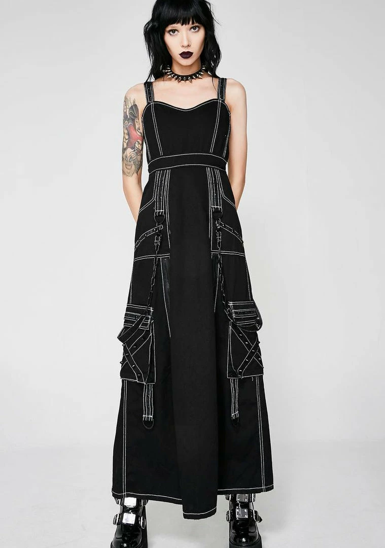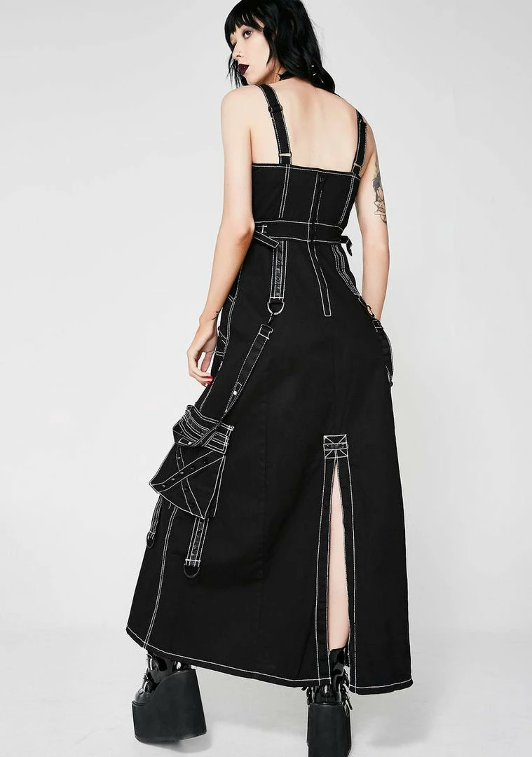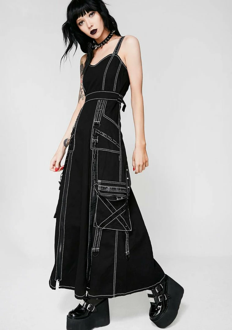 step in the dark side.. This sikk af max dress that has chain straps N cargo pockets with studs on emâ, slits on the front Nâ back, white contrast stitching all ova and a zip closure.