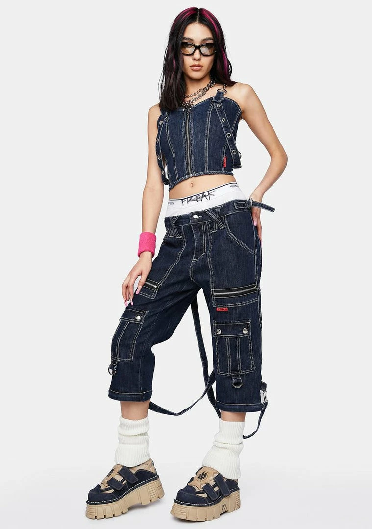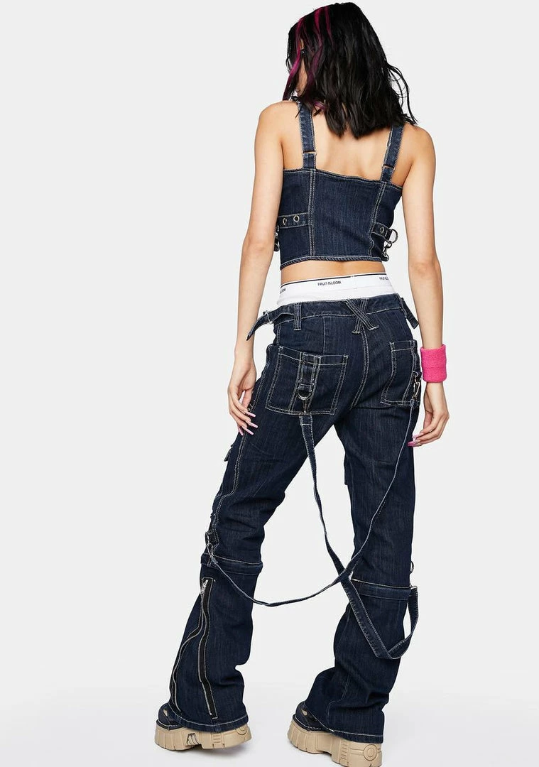 cuz you donât mean to be brutal. These denim bondage strap pants have a zip-off leg design that converts into capris, D-ring and zipper hardware, cargo pockets on the front and back, adjustable side waistband tabs, and a zip-fly closure.