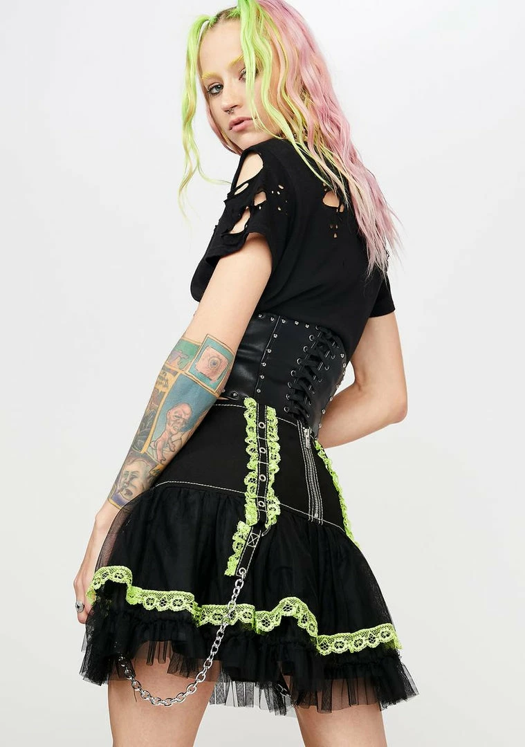 cuz you’re pretty and punk. This mini chiffon tutu skirt has lace trim, chain details, and a high waist fit.