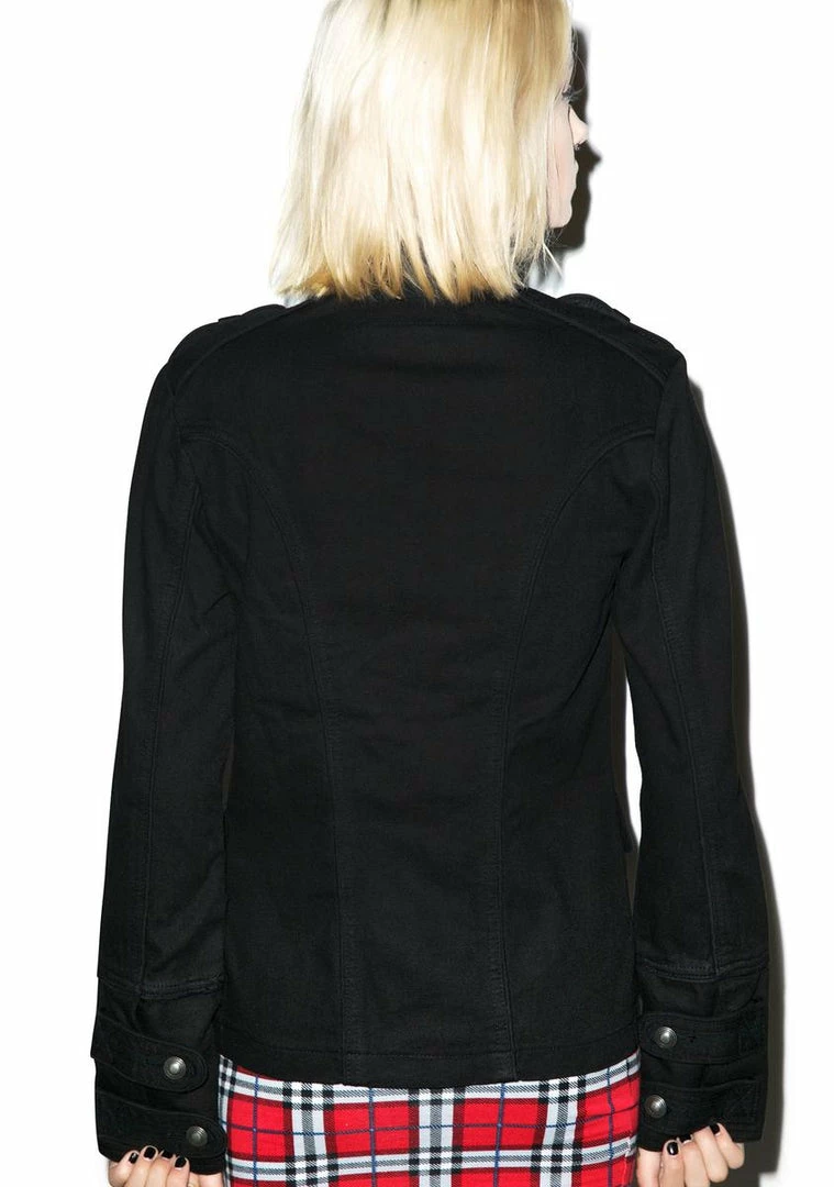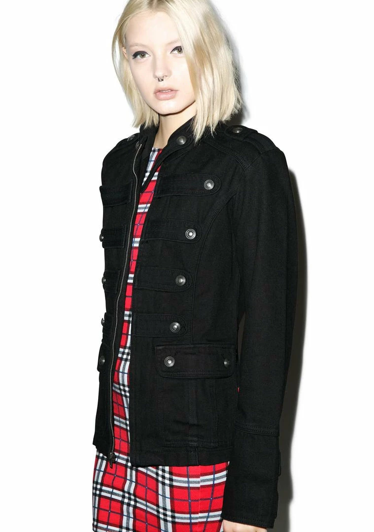 Tripp NYC Guard Me Jacket cuz ya can let yer guard down, bb, this jacketÂs all ya need! Featurin a uniform style front with faux straps and buttons, shoulder epaulets, collar and sleeve buttons and a zip closure, yer gonna be callin all the shots. Two front flap pockets give ya all the space ya need for yer artillery. Yer in command now, bb, so guard yer fortress in this gorgeous jacket!