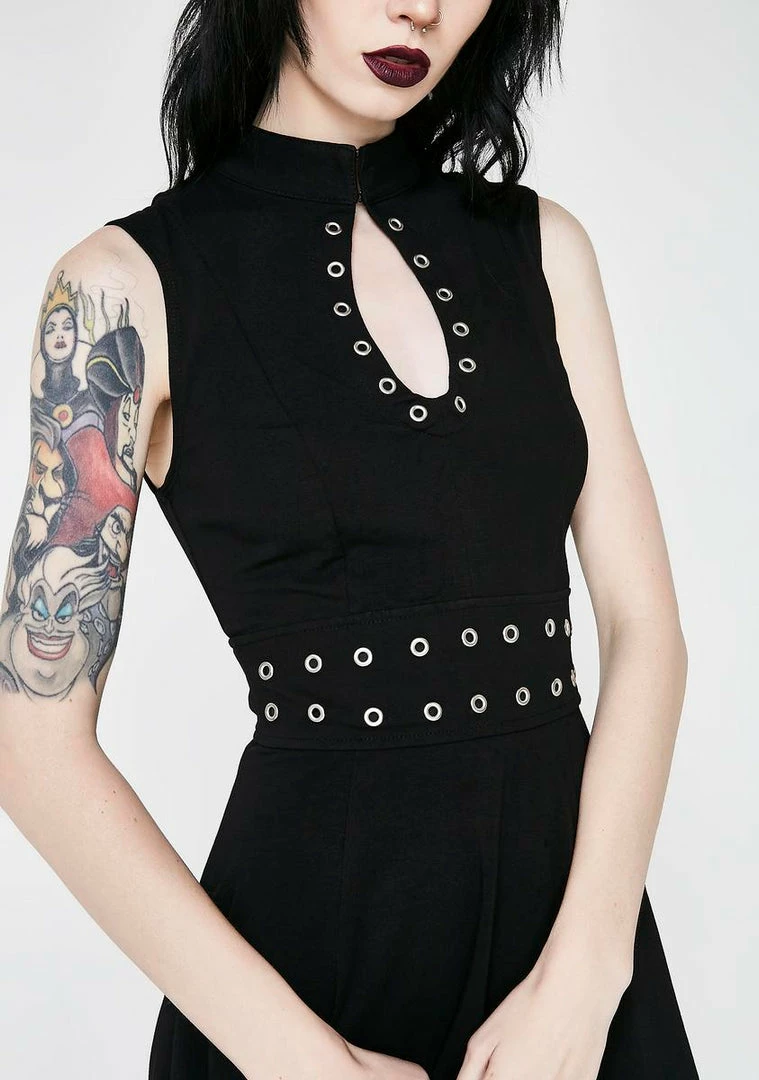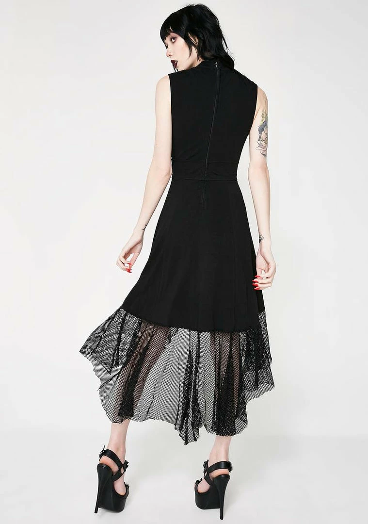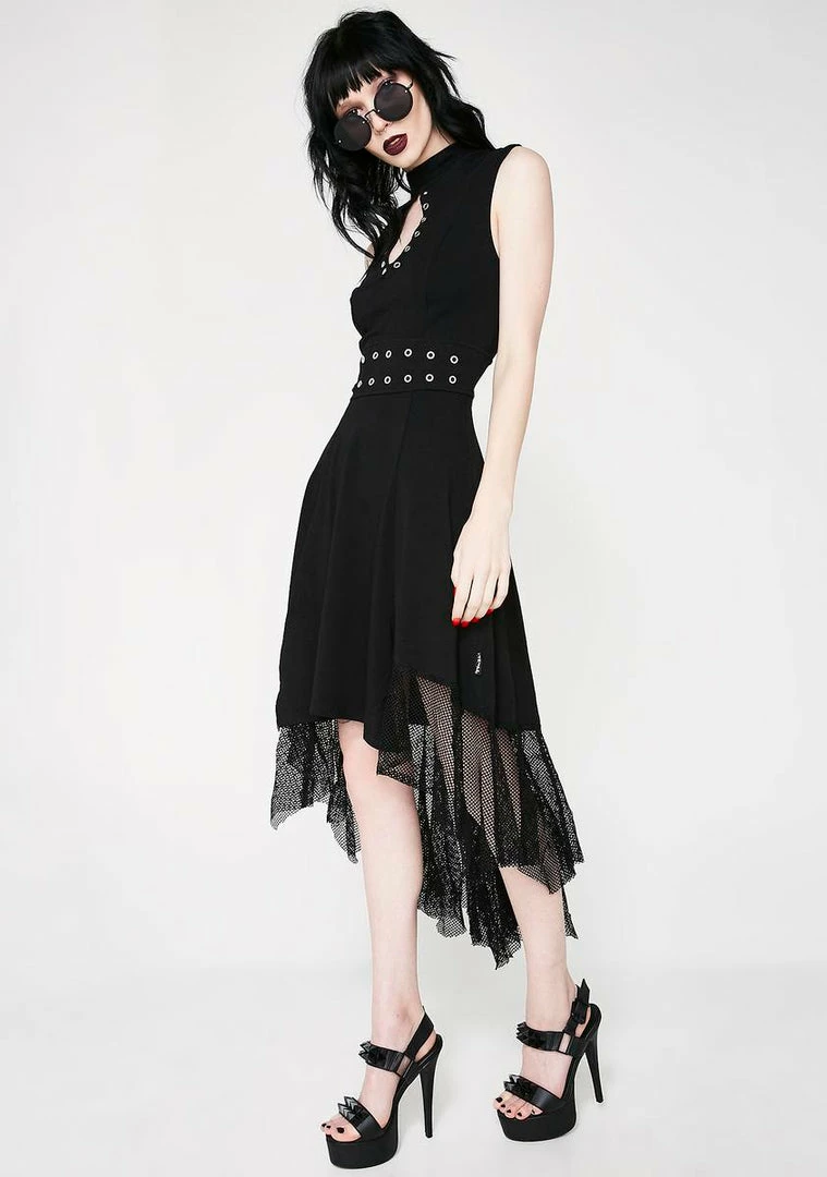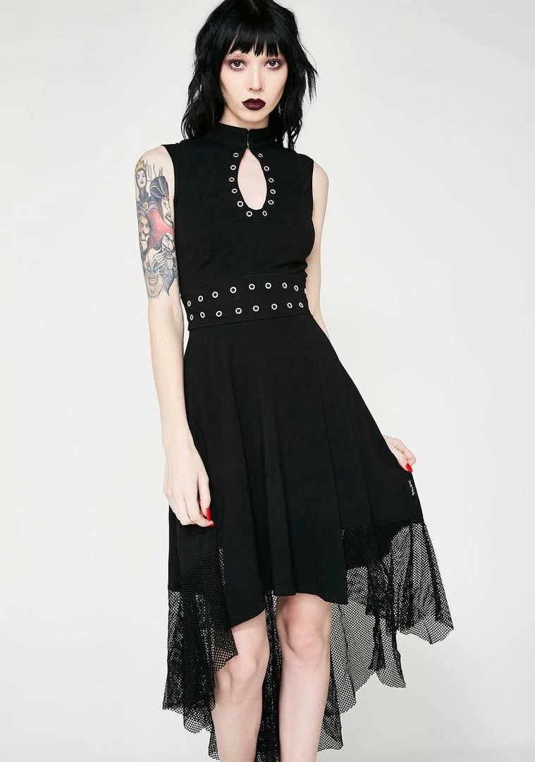 cuz you got emâ in a spell. Have emâ fallinâ for you with this sleeveless high low dress that has silver eyelet details, a mesh detail on the skirt and a zip closure.