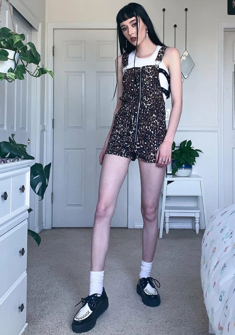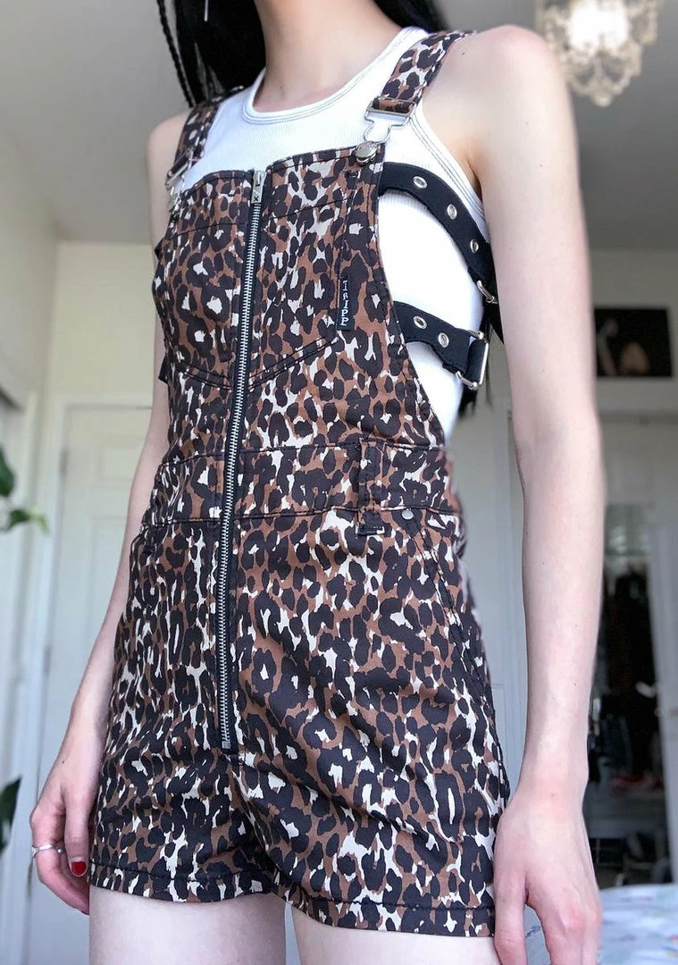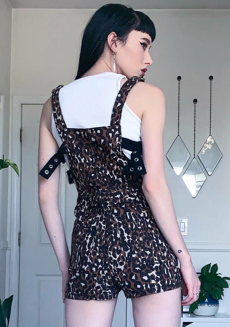 gotcha doinâ the most when they least expect it. Stun âem in these rad leopard print short overalls that have grommet side straps, adjustable shoulder straps, back pockets and a front zip closure.