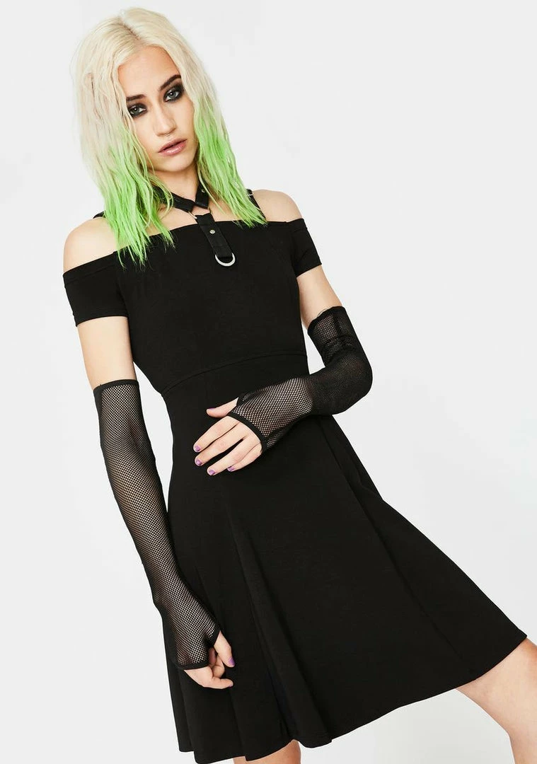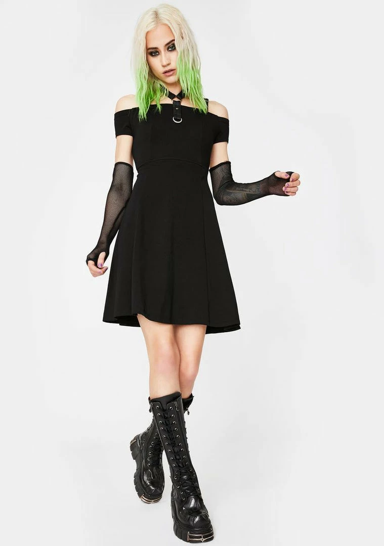 cuz the darkness lives within you! Rule the night in this wicked fit Nâ flare mini dress that has an off the shoulder neckline with a halter bondage strap, adjustable straps, and a hidden back zip closure.