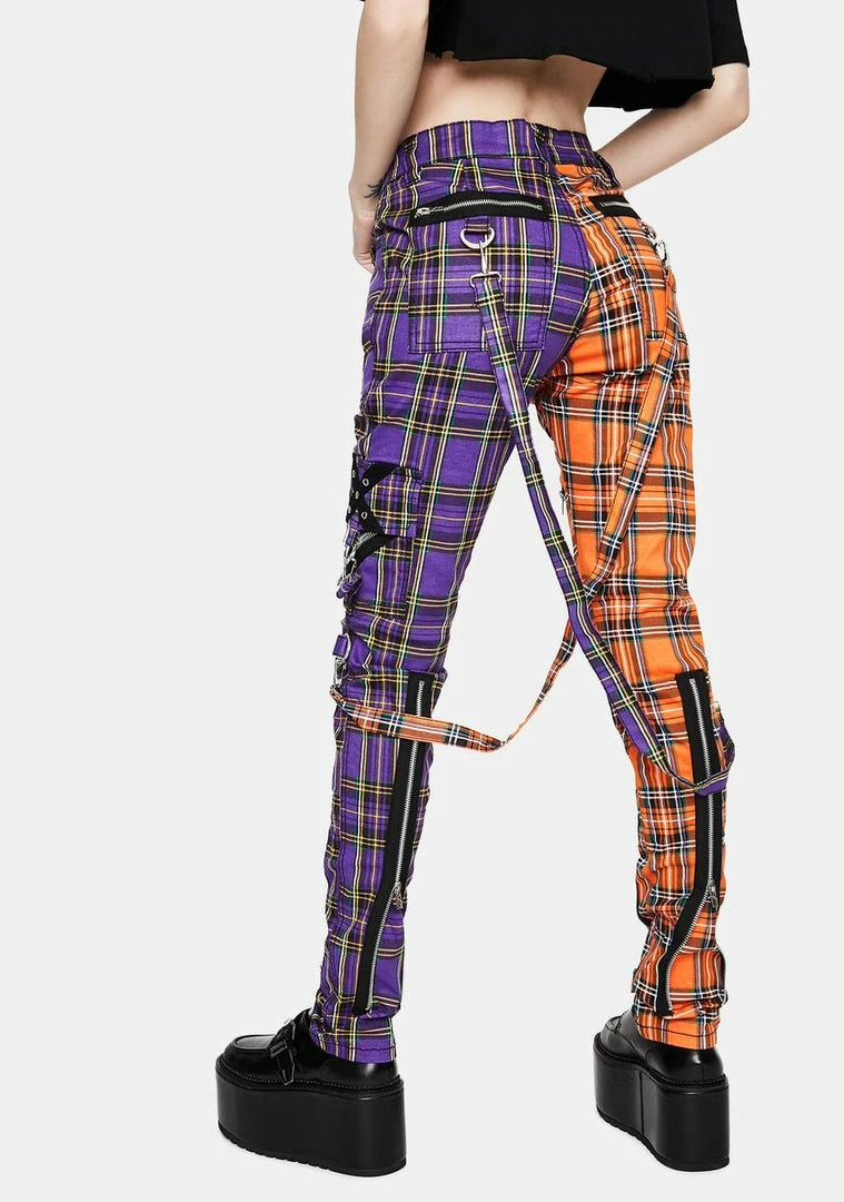cuz youâre causing a commotion. These split plaid skinny pants have removable bondage straps, adjustable zipper details, and pockets on the front and back.