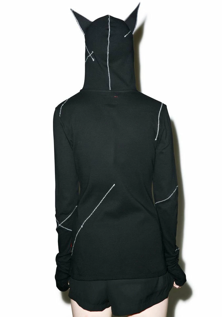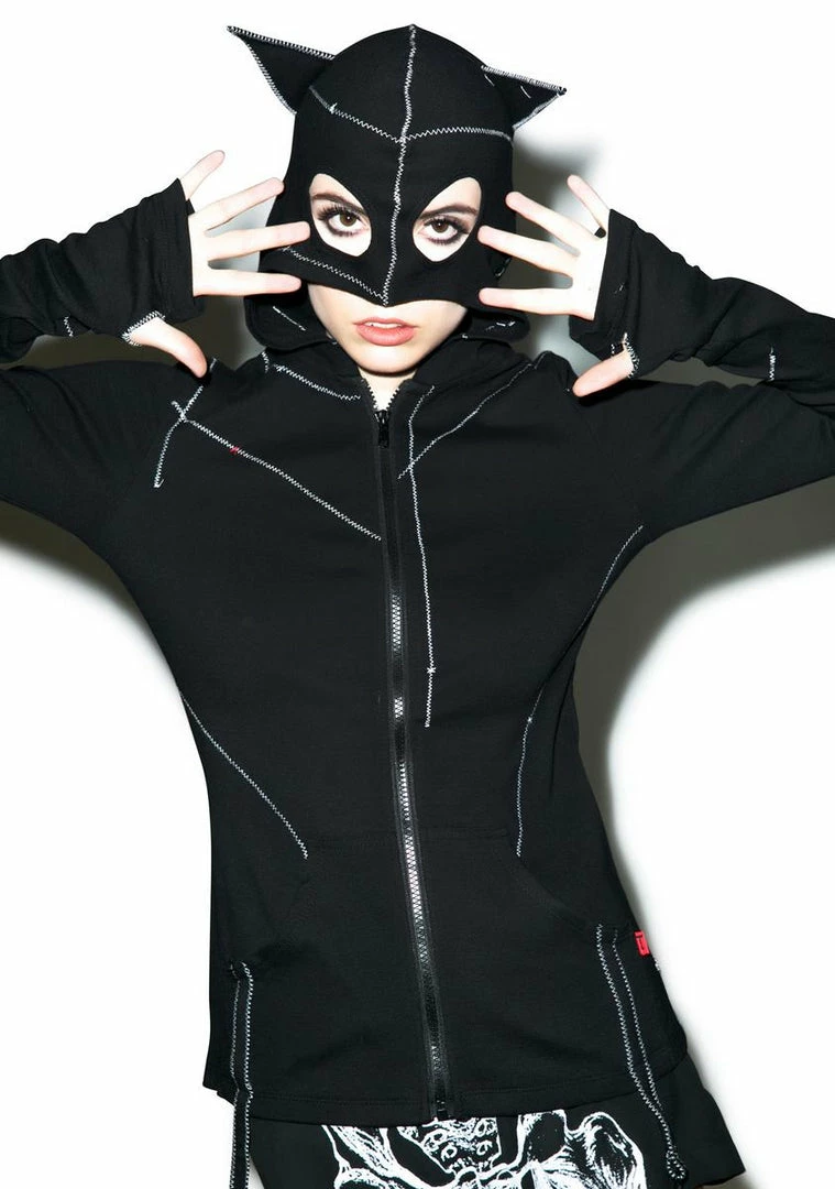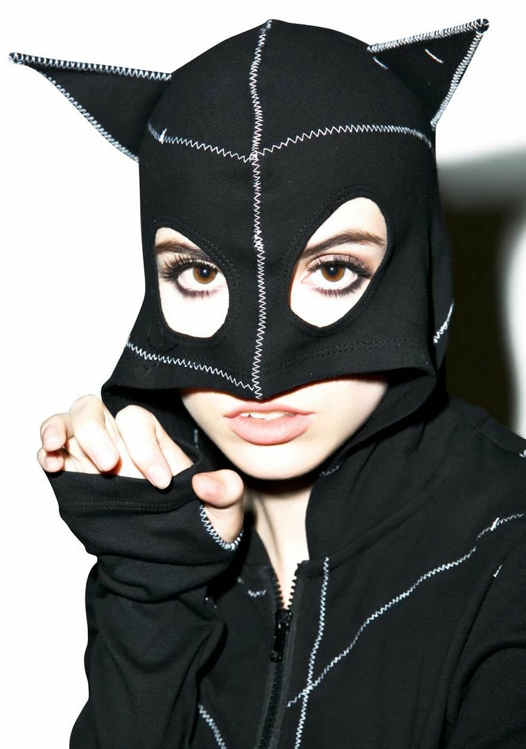 has been a very bad kitty. This awesome relaxed fitting zip-up sweatshirt is constructed from a super soft material with white contrasting exposed stitch details. Featuring an attached hood with eye cut-outs and cat ears so ya can really prowl and long sleeves with thumb holes.