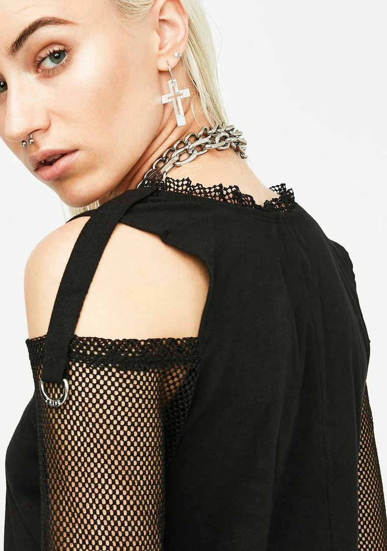 cuz it’z so much fun on the dark side. This top has a scoop neck with mesh trim and off the shoulder sleeves with thumb holes.