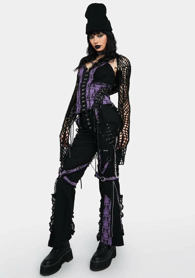 cuz you’re extraordinary. These pants come in a twill flared construction, with pockets, corset style lacing and garter straps, ruffle trim details, and grommet details.