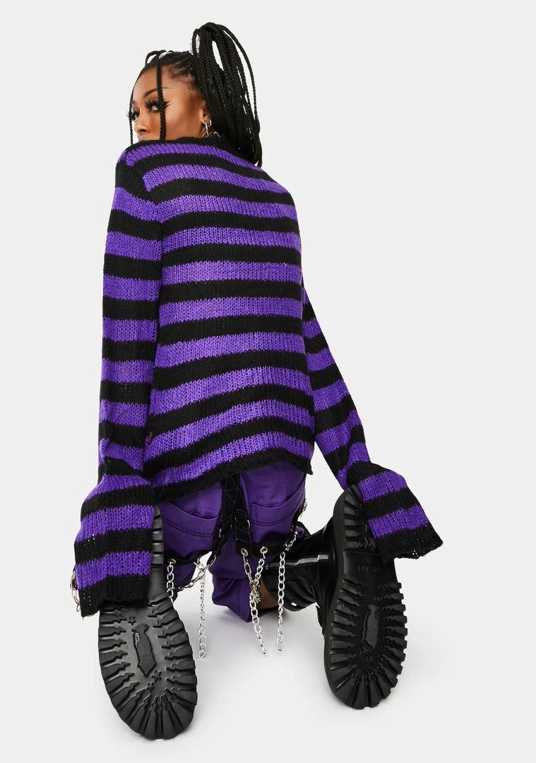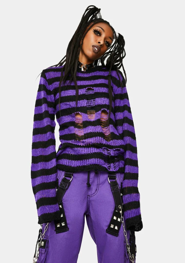 forget the riches, this suits you just fine. This knit sweater has a distressed ribbed knit construction with a high neckline and extra long sleeves.