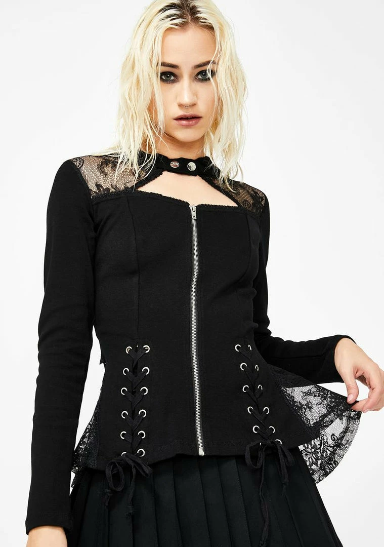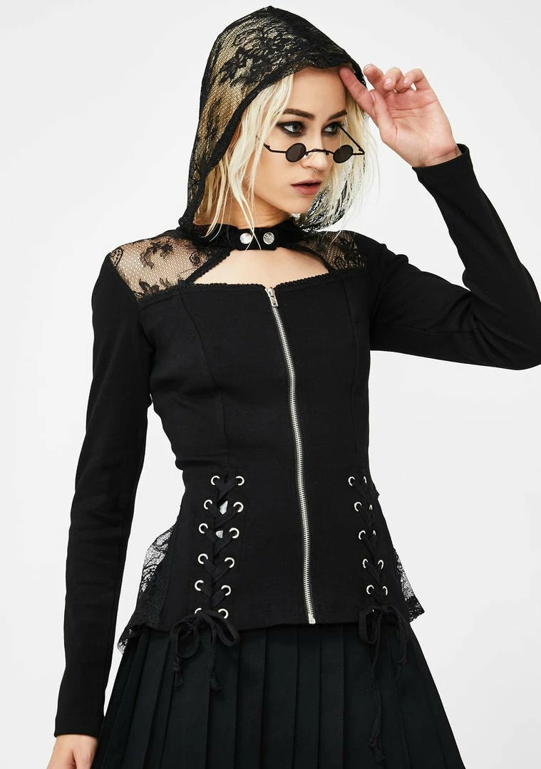 cuz youâre the queen bee of the online hive. Send out yer drones in this peplum hoodie that has a sheer lace hood, lace-ups on the front, a square neckline Nâ front zip closure.