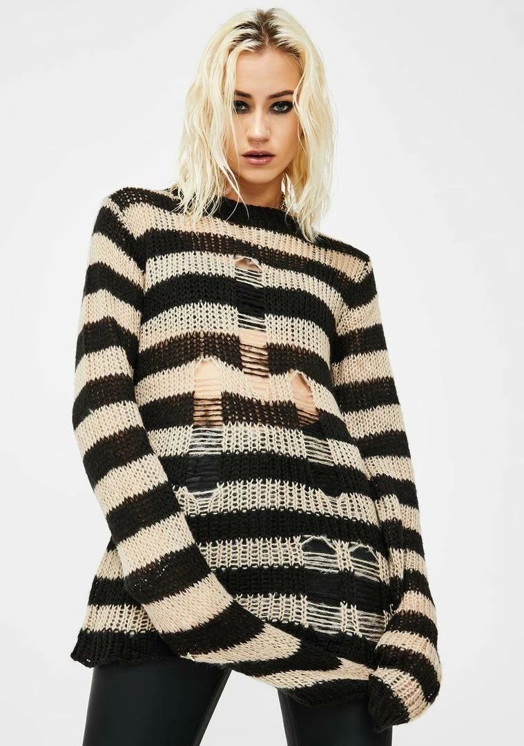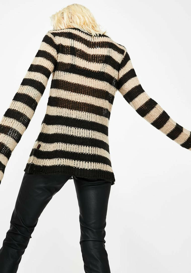 forget the riches, this suits ya just fine. Embrace yer imperfections in this rad knit sweater that has a supa soft Nâ distressed ribbed knit with a high neckline and exxxtra long sleeves.