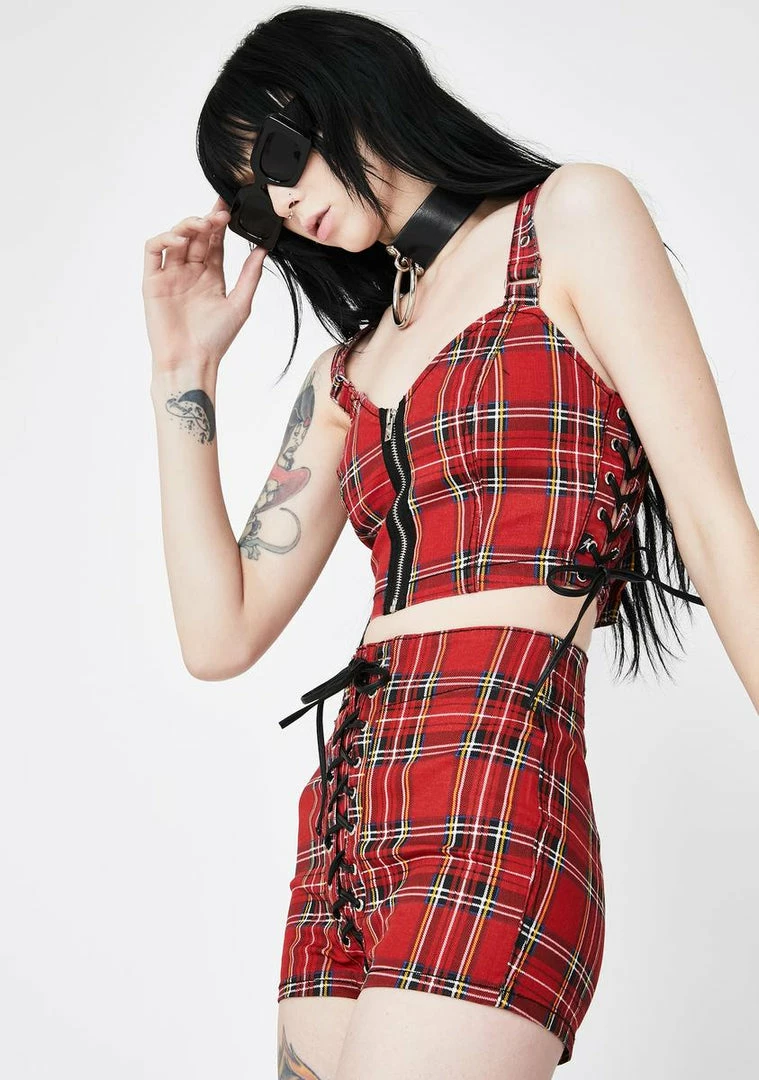 cuz youâre a rebellious babe! Go against the grain in these high waist corset shorts that have front to back lace-up closures, a hidden zip closure Nâ a plaid print all ova.