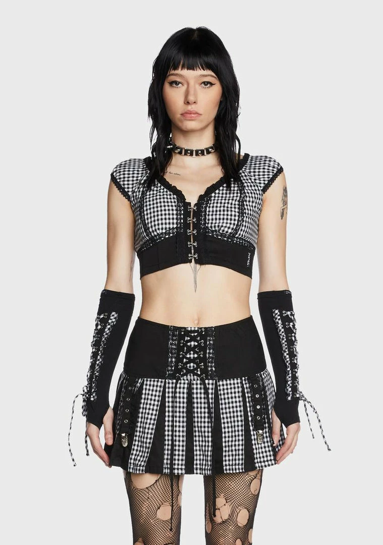 got ’em on your bad side! These arm warmers have a gingham print, adjustable lace-up ties with hook-and-eye hardware, and thumbhole cuffs.