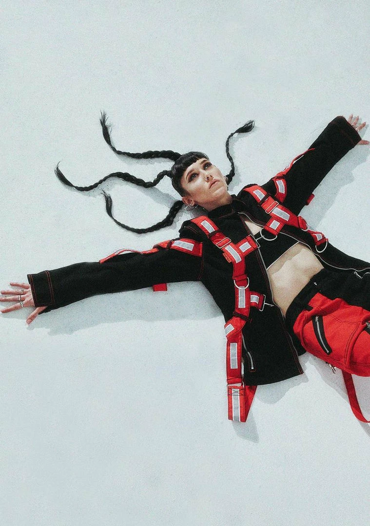 cuz youâve got an electric energy! Give âem a shock to the system with this sikk collared jacket that has bondage straps with reflective trim, D-ring accents with clip closures, and an exposed front zip closure.