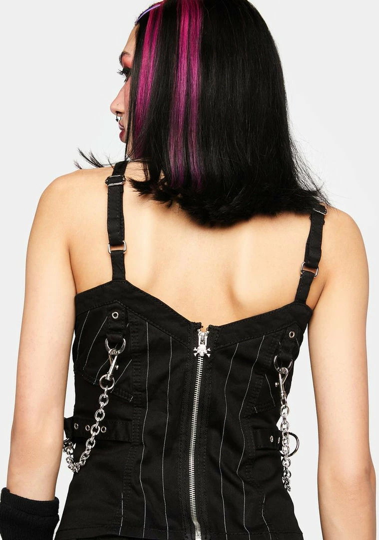 you’ve got what it takes. This corset top has a vertical striped design, a strappy V-neckline with silver grommets, a lace up detail down the front with D-ring hardware, detachable chain straps, and a zipper closure at the back with a skull charm.