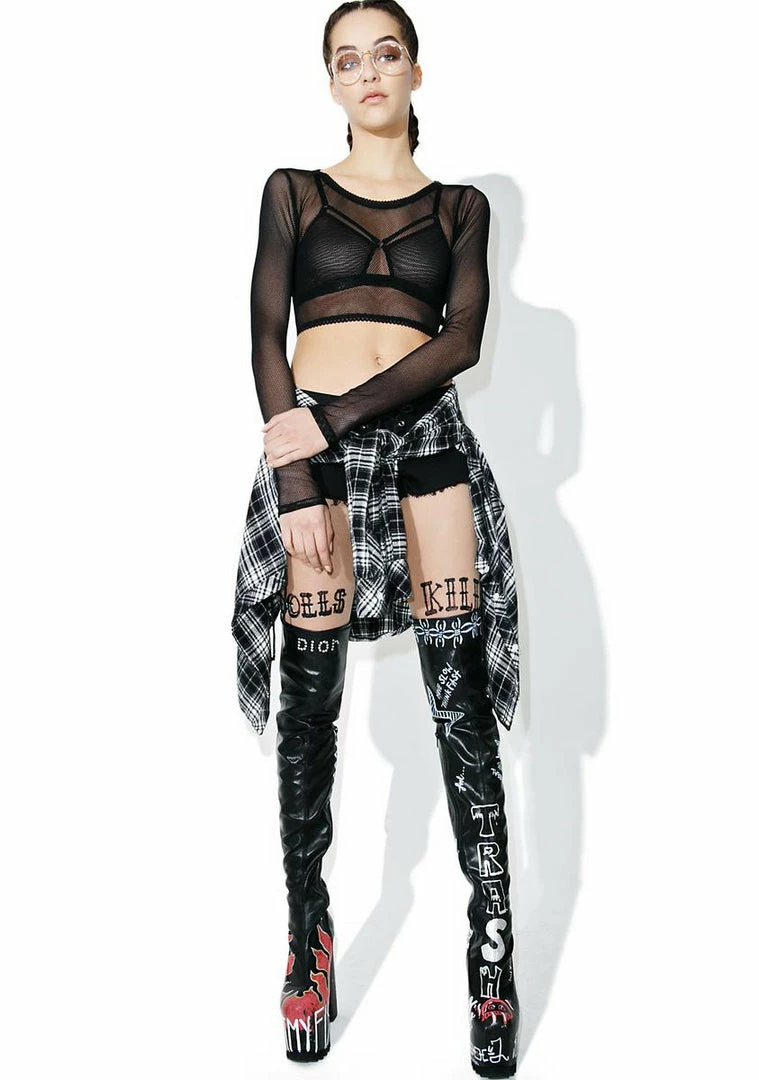 yew see right thru their gamez, bb. Take no sh*t in this crop top that features a black mesh construction, round neckline, and long sleeves.