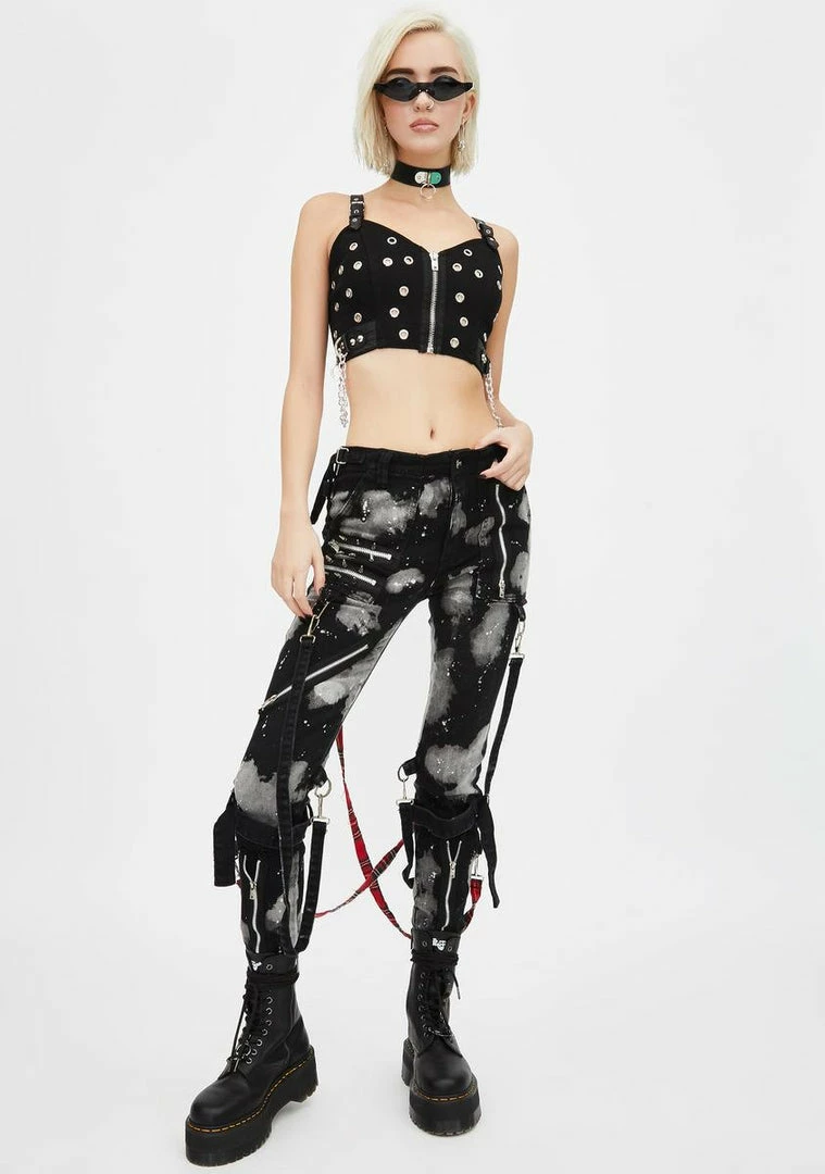 will give âem hardcore bliss. Stay lethal in this grommet crop top that has draped chain hardware, a front zip closure, and adjustable buckle straps.