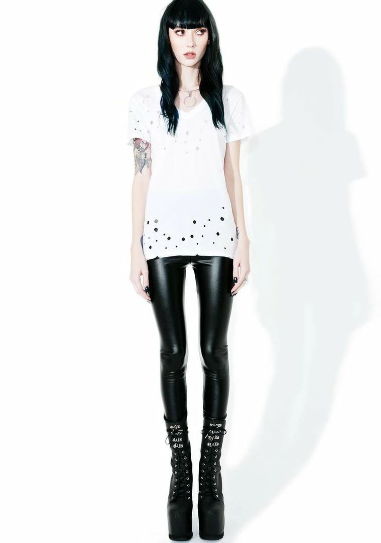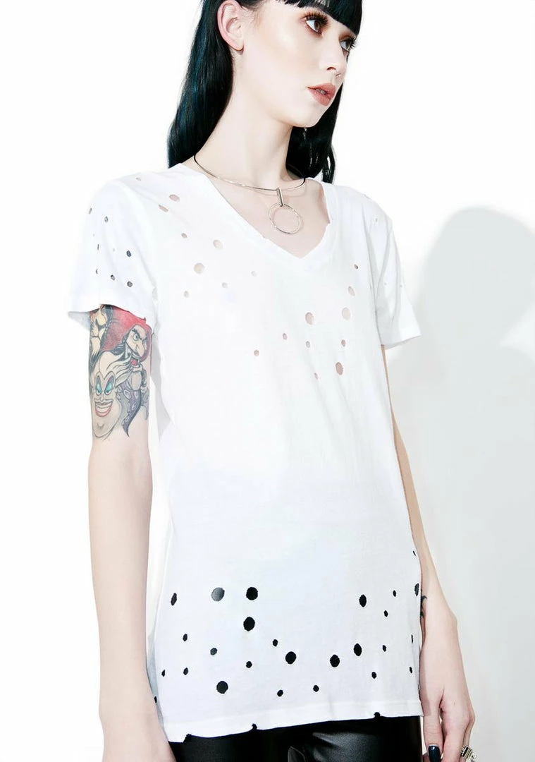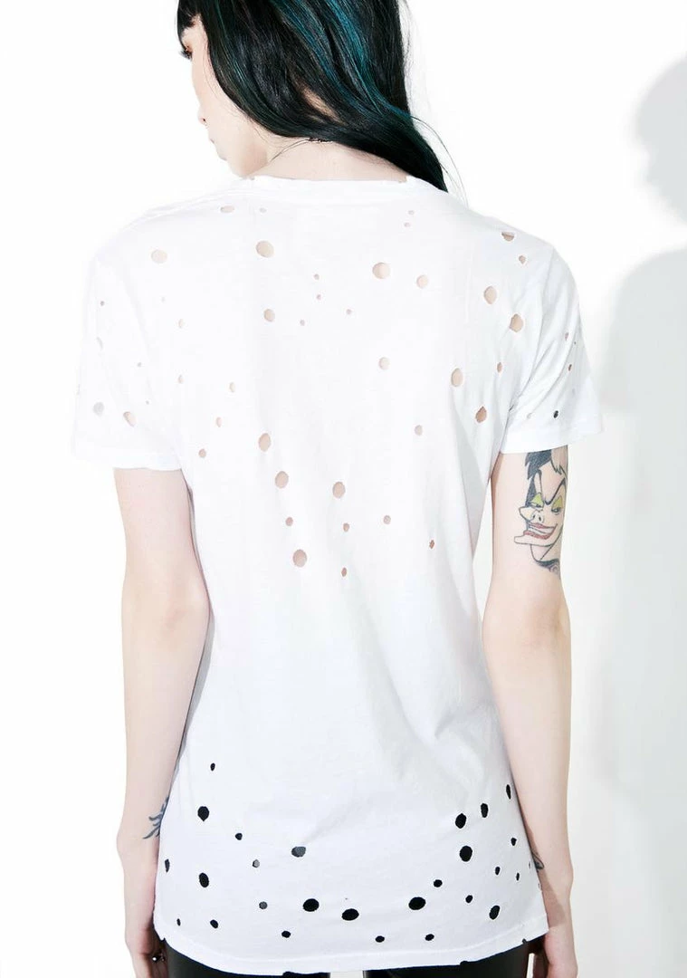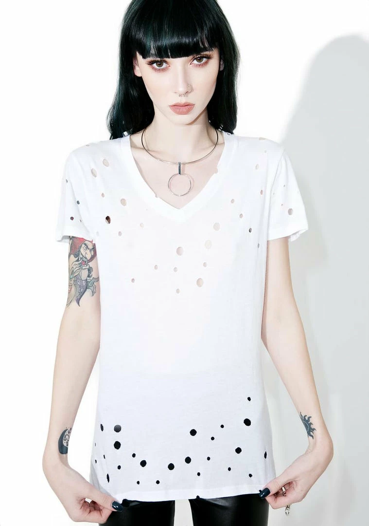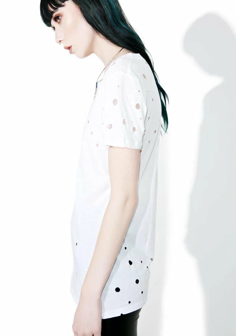 is beaten, broken and bruised. This distressed short sleeve t-shirt has seen better days with a ton of holes that are cut all over ya bod. Featuring short sleeves, a soft as hell cotton construction and sik relaxed slim fit.