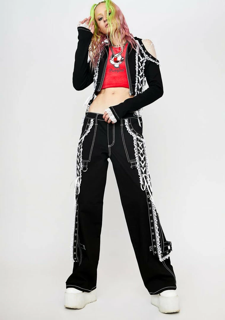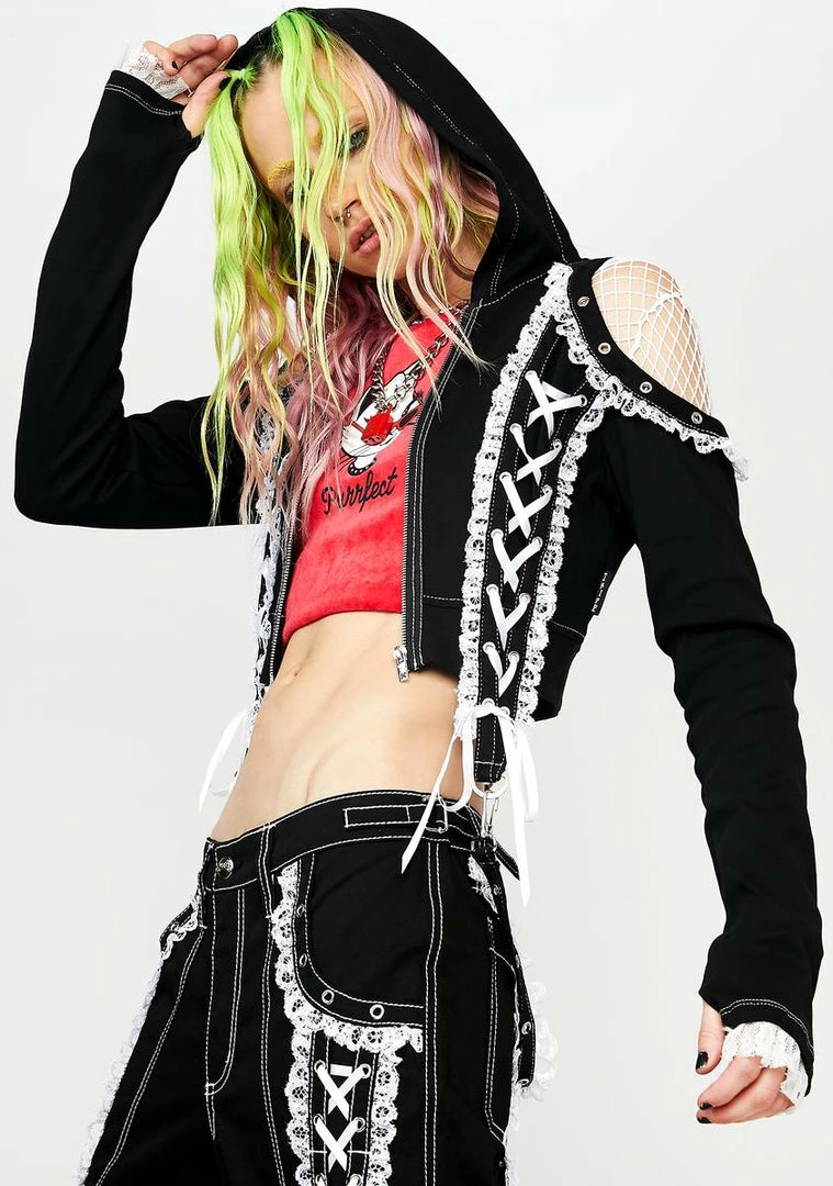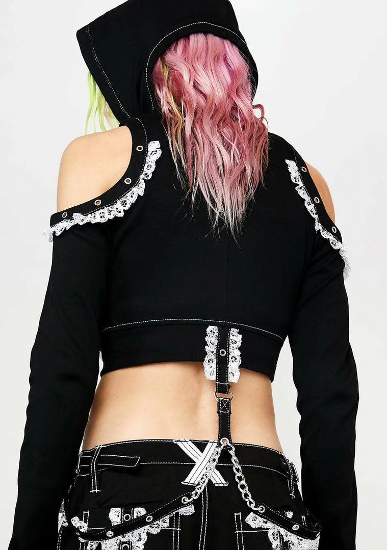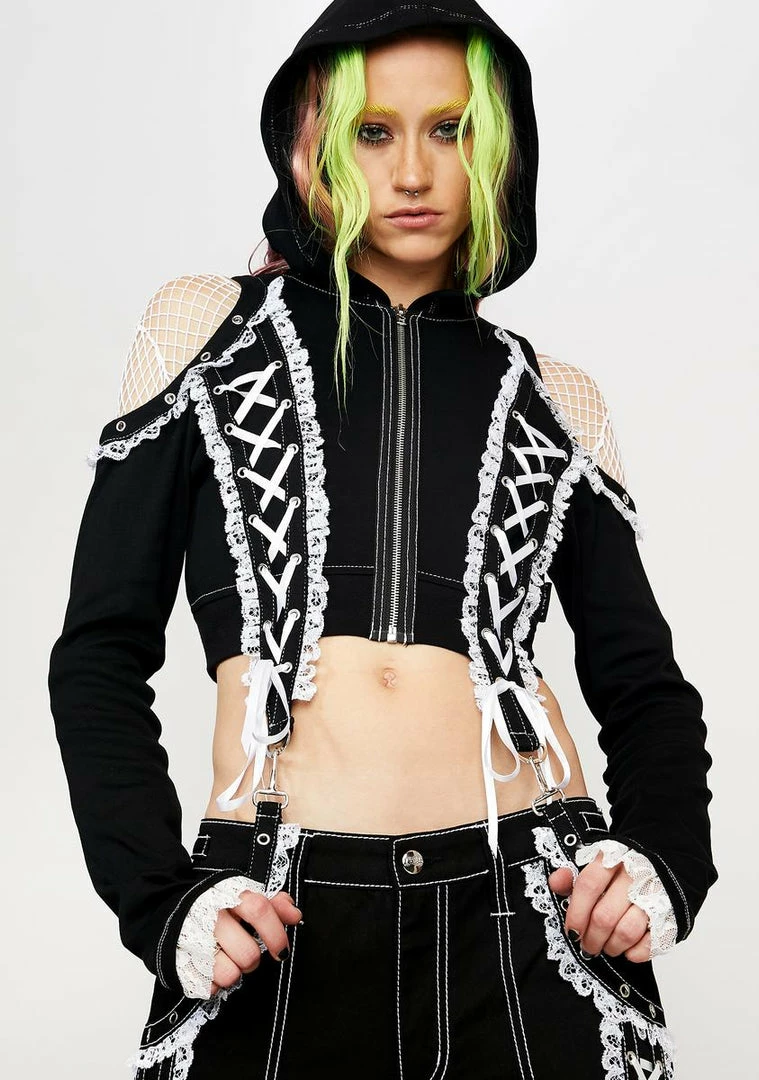 give âem a dark romance, babe. This crop hoodie has a front zip closure, cold shoulder cutouts, lace trim, and lace-up details.